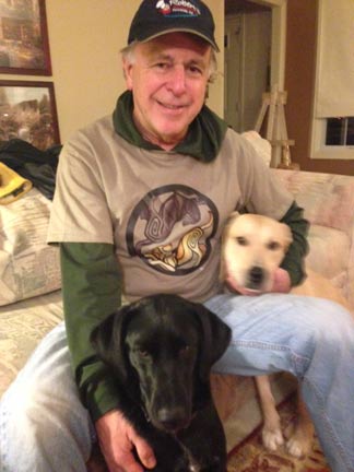 Mike loves his new shirt. Here he is with our two dogs, Boo & Bo.